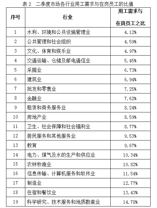 二、科學研究、技術服務和地質(zhì)勘查業(yè)、住宿和餐飲業(yè)、制造業(yè)等行業(yè)用工需求明顯,水利、環(huán)境和公共設施管理業(yè)、公共管理和社會組織、文化、體育和娛樂業(yè)等行業(yè)用工需求平穩(wěn)。