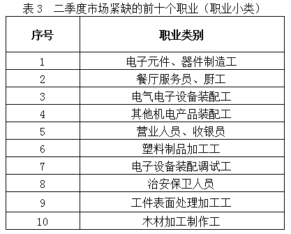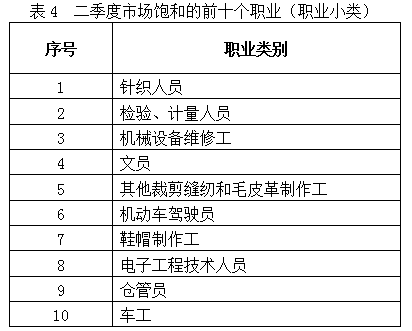 全省人力資源市場供求狀況監(jiān)測顯示,二季度科學研究、技術服務和地質(zhì)勘查業(yè)、住宿和餐飲業(yè)、制造業(yè)等用工需求較明顯,需求人數(shù)與在崗員工數(shù)的比值均在12%以上;水利、環(huán)境和公共設施管理業(yè)、公共管理和社會組織、文化、體育和娛樂業(yè)等用工需求較平穩(wěn),需求人數(shù)與在崗員工數(shù)的比值均在5%以內(nèi)(附表2)。電子元件、器件制造工、餐廳服務員、廚工、電氣電子設備裝配工等工種較為緊缺(附表3);針織人員、檢驗、計量人員、機械設備維修工等工種趨向飽和(附表4)。