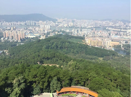 孩子們的精力永遠(yuǎn)是最充足的,奔跑著,問這問那,天真爛漫。那幾個正值青春的年輕人走在最前頭,步伐矯健,仰頭挺胸,不多久就讓我們一票“老人”落在了后頭。不過十來分鐘,我已經(jīng)撐著老腰,有點(diǎn)氣喘吁吁了。停一停、駐一足,看看一路上秋日里的生機(jī)勃勃。那幾簇盛開的山間野花,那幾棵掛滿野果的不知名樹,還有林間鳥兒嘰嘰喳喳的歡唱,都讓我好不自在。談笑間,不知不覺中,我們就登上了韶陽樓頂?!氨鄙桨自评铮[者自怡悅。相望試登高,心隨雁飛滅。”我雖無滿腔熱血、無壯志凌云、無憤懣情懷,卻在這高山之頂、遠(yuǎn)眺之時,膨脹出萬分感慨。滿眼的青蔥翠綠,還有不遠(yuǎn)處錯落有致的高樓大廈,讓我想起呂雯的歌詞“自從遇見你,生命比以前更有意義。”這一刻,我要感謝生命里的領(lǐng)導(dǎo)、同事、朋友們,給我力量,與我共行。